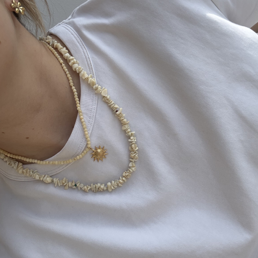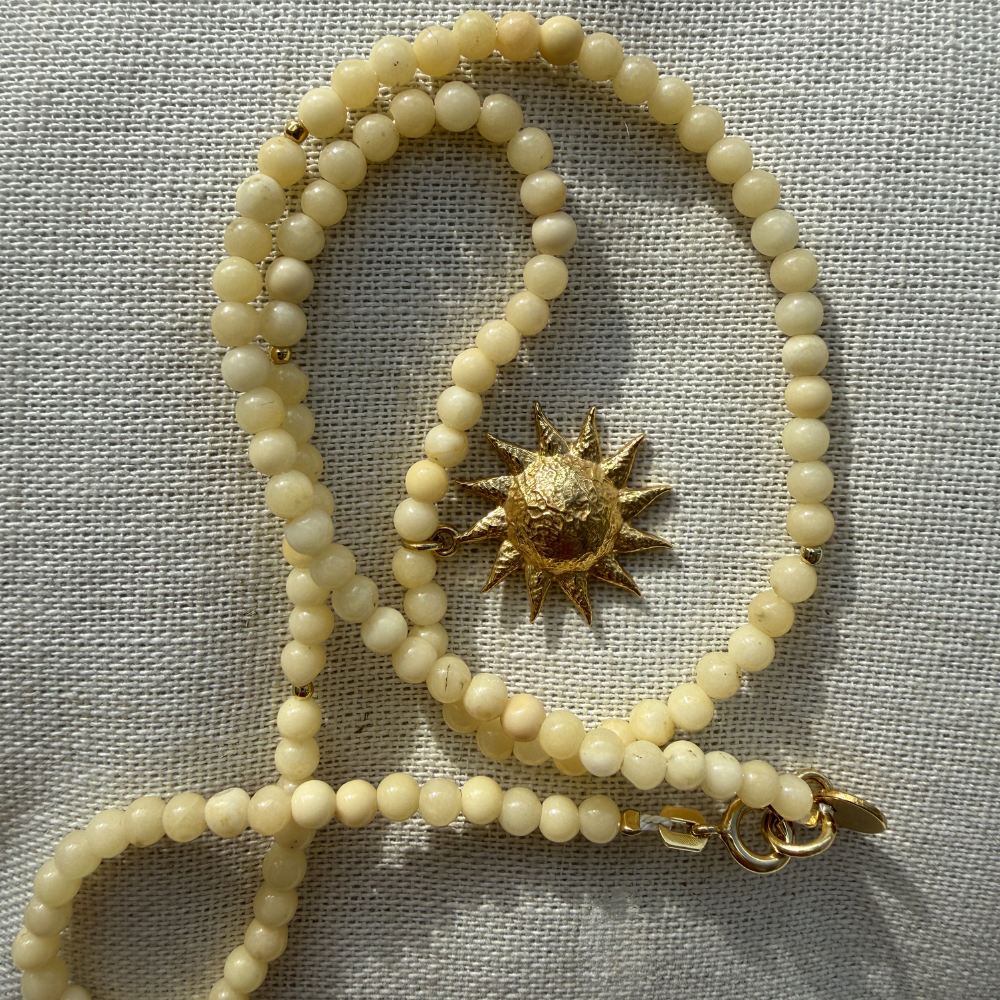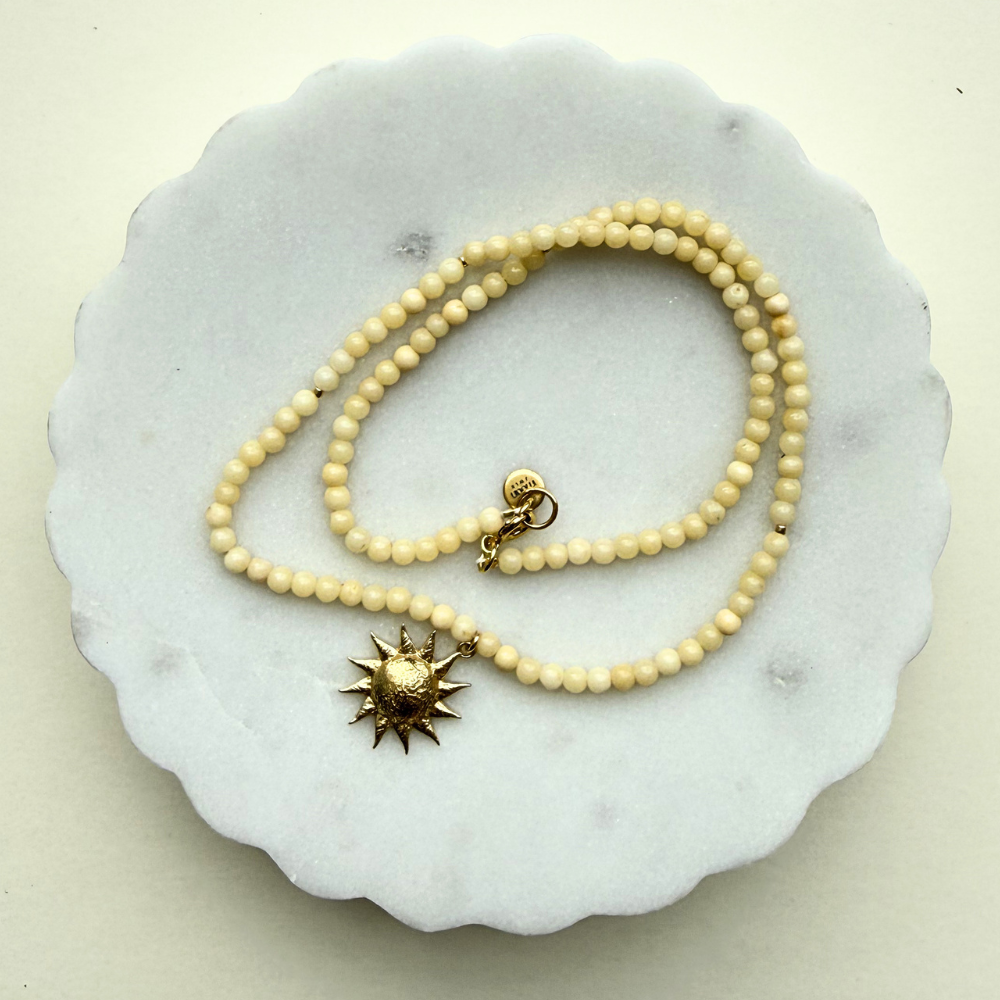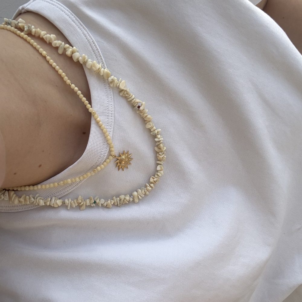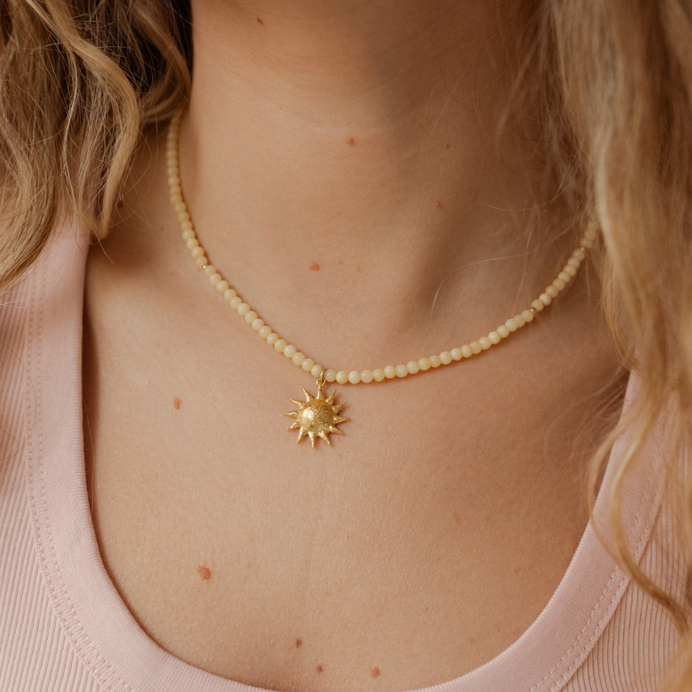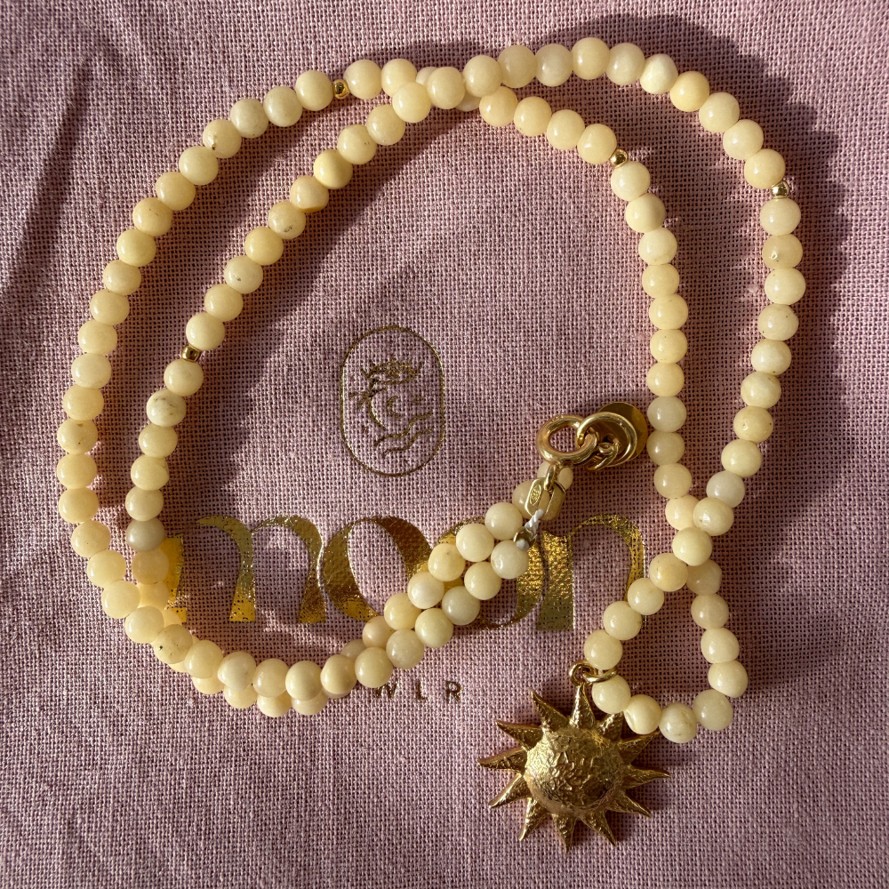 Wykonany z wysokiej jakości materiałów, zapewnia trwałość i wyjątkowy wygląd. jaspis o kształcie kulki 3mm, zawieszka słońce złocona 2μm. Zapięcie srebrne, złocone 0,3μm, oraz blaszka z logo moon jwlr wykonane ze stali chirurgicznej.