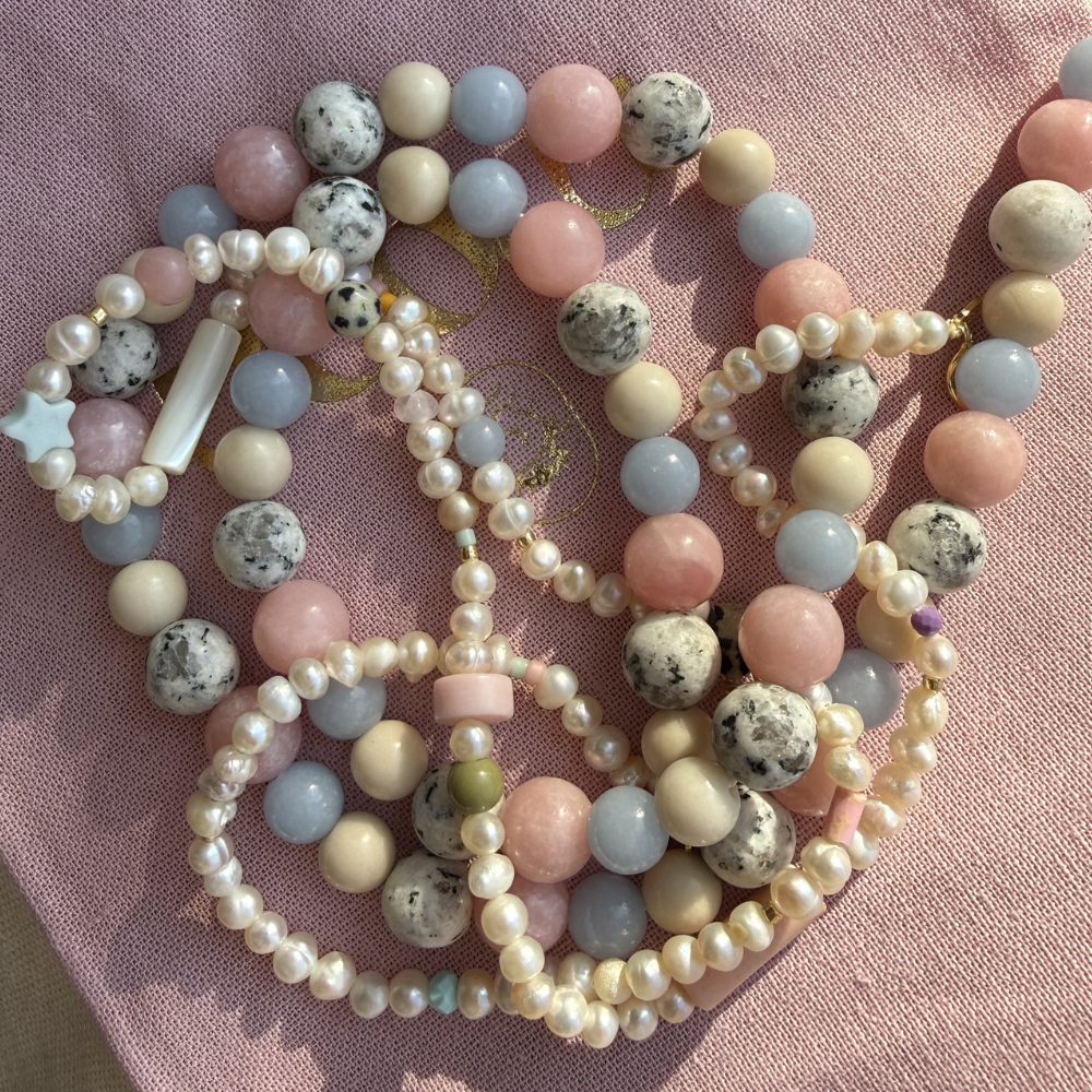 Wykonany z wysokiej jakości materiałów, zapewnia trwałość i wyjątkowy wygląd. Użyte kamienie: opal, jaspis, chalcedon w kształcie kulki. Zapięcie srebrne, złocone 0,3μm, oraz blaszka z logo moon jwlr wykonane ze stali chirurgicznej. Nylonowa nic jubilerska o grubości 0,6mm.